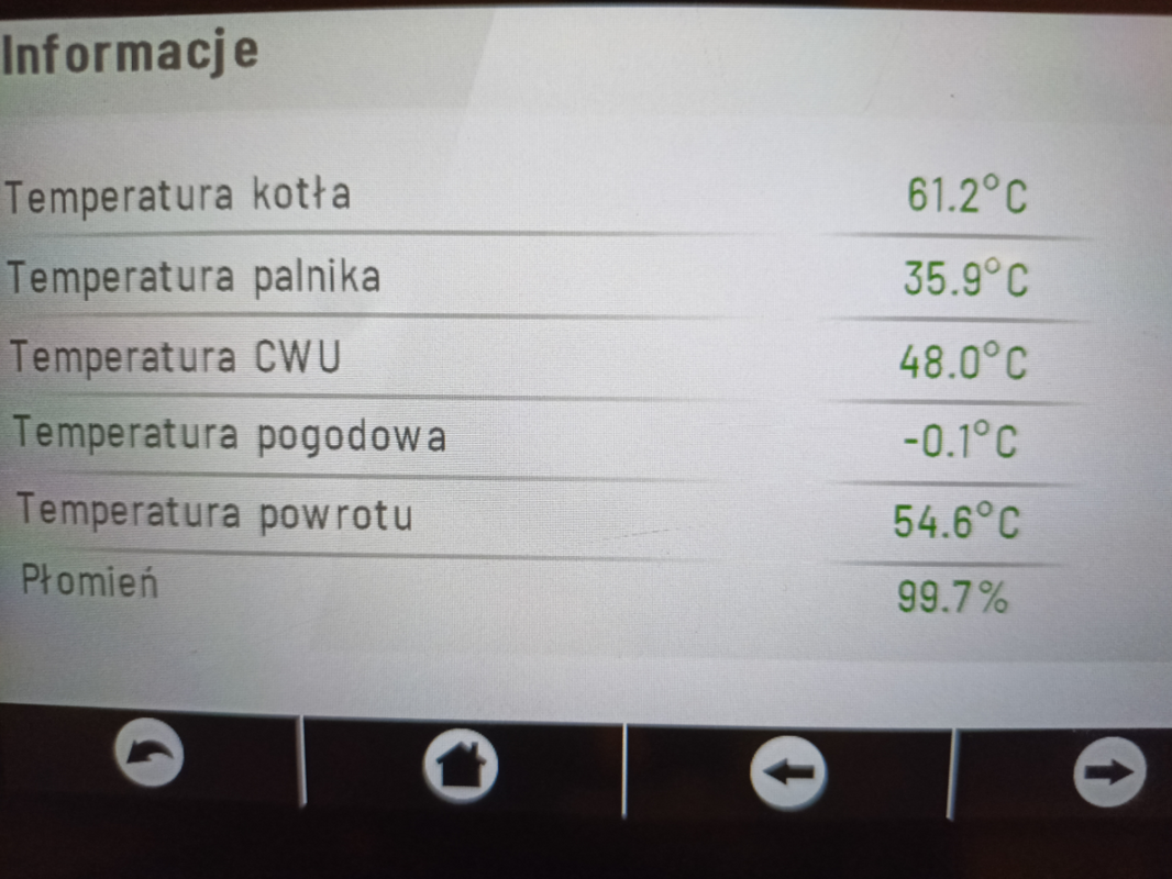 2. Policzyłem worki. Spalanie średnie jest na poziomie 25-28 kg na dobę. Ogrzewanie i CWU. Licząc od poczatku paździrnika. Teraz przy temperaturze ~minus 3 w nocy to chyba przekracza 30kg. Wygląda, że nie chodzi często ale podawanie ma prawie non stop jak chodzi. Sterownik podaje coś takiego jak strumień paliwa. Przy CWU to jest 1,75kg/h a jak grzeje dom to 3,75kg/h.