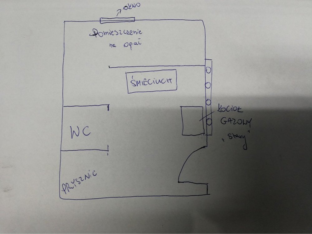 Tak wiem to moja kotłownia ( teraz ) , bo ten dom kupiłem i wiem doskonale że w takim układzie jest to niezgodne z prawem i niebezpieczne. Dlatego chcę to zmodernizować i zrobić to porządnie :) Tak się głęboko zastanawiam czy warto zostawiać ten stary kocioł zasypowy, bardziej chyba bym był za tym aby go zlikwidować ale przyłącze do kotła zostawić i w razie czego zawsze jakiegoś "śmieciucha" można będzie wstawić tym bardziej że chce tak jak pisałem wyżej zmodernizować kotłownie. Dołączam skromny zrzut jak to teraz wygląda. Po zmianach zrobił bym to tak. Kocioł zasypowy przenieść w miejsce Pomieszczenia na opał a w jego miejscu powiesił kocioł gazowy i tutaj pytanie czy faktycznie zrobić 1F z zasobnikiem na C.w.u? Czy lepiej kocioł 2F ? Na pewno jakieś "żeberka" dojdą tym bardziej że jedno pomieszczenie na razie nie ma żadnego grzejnika. A co powiecie o kotle termet ecocondens gold plus czy to niepotrzebny wyższy wydatek?