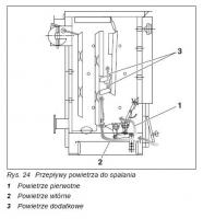 W tym przypadku to będzie powietrze dodatkowe. Wpływa ono tylko na dopalenie wydzielających się gazów, nie wpływając na podtrzymanie palenia się paliwa (powietrze nie przepływa przez nie. Jako przykład rozwiązania podaję rys. Kotła Junkers. W tym przypadku sprawdza się, zwłaszcza po modyfikacjach. jak widać powietrze pierwotne i wtórne doprowadzane jest bezpośrednio w okolice paleniska - pierwotne pod , a wtórne tuż nad. Powietrze dodatkowe wprowadzone jest powyżej mniej więcej w połowie komory spalania z własną, niezależną regulacją (ruchoma przesłona).