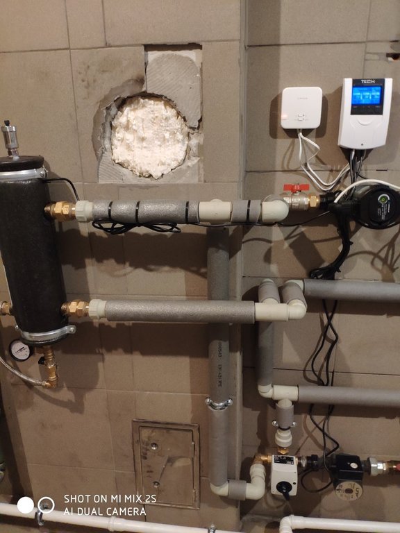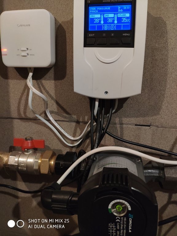 Witam, również mam ogrzewanie mieszane podłoga i grzejniki. Domek parterowa pow. 150 m. Nie mam czujnika zewnętrznego. Sterownik Techa, sprzęgło, zawór z siłownikiem 3D, grzejniki z głowicami. Podobnie jak u przedmówców. Piecyk (pompa) utrzymuje tem. sprzęgła i zasobnik 160 litrów Biawar. Za sprzęgłem 2 pompy na podłogę i grzejniki. Jestem zadowolony spalanie tak jak dzisiaj przy -2 w dzień i - 3 w nocy wychodzi około 8 metrów gazu na dobę. Na sterowniku zadane mam 22 stopnie. Histeryza 1. Załączam kilka fotek. Pozdrawiam.