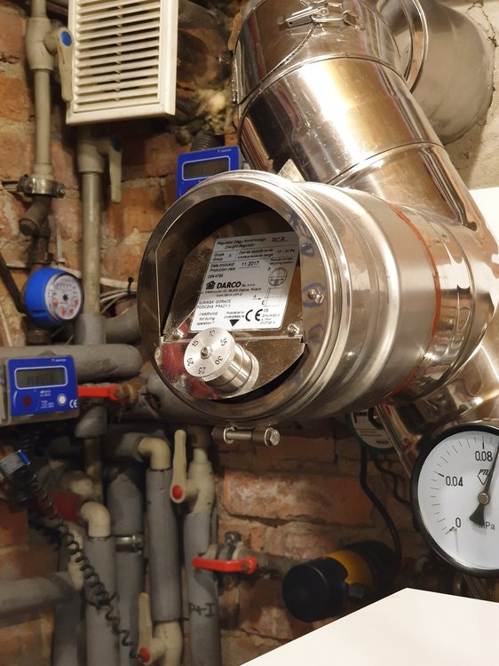 Hej. Kolego, na zbyt duży ciąg kominowy polecam Ci to rozwiązanie jak poniżej tzw regulator ciągu komina. Nie dość, że obniża podciśnienie to w przypadku wiatru stabilizuje ciąg. Fajnie to widać przy wietrznej pogodzie jak klapka się uchyla gdy jest mocniejszy powiew wiatru.