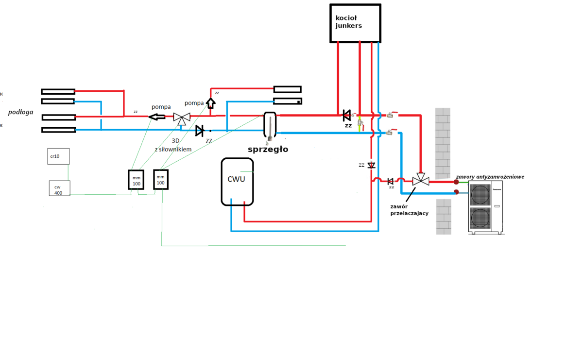 Powoli temat pompy ciepła zbliża się wielkimi krokami i chciałbym sobie to poukładać w głowie. Pompa będzie Panasonica 5KW monoblok, będzie pracować w trybie biwaletnym, dogrzewanie w razie mrozów będzie kotłem gazowym. Dziękuje @carinus za dużo informacji. Co do sterowania, to jeszcze nie wiem jak to rozwiąże, zobaczymy jakie opcje sa integracji pompy z kotłem. Druga sprawa sprawdziłem i po rozłączaniu zworki termostatu pokojowego on/off w kotle, kocioł steruje wszystkimi obiegami i zaworem 3d tylko nie załącza palnika wiec tez to można w pewnym stopniu wykorzystać do sterowania. Poproszę o sugestie odnośnie rysunku, zamysł jest taki żeby przez pompę kiedy nie pracuje bo są mrozy przepuszczać ciepła wodę. Obecnie w instalacji jest sprzęgło wiec ono pozostaje, na zielono bypass na wypadek jakiejś awarii edit: teraz jeszcze zastanawiam co się będzie działo kiedy zawór cwu będzie w złym położeniu a załączy się kocioł, chyba ze będzie to jakiś elektro zawór który będzie w pozycji otwartej gdy pompa nie działa i będzie otwierał przepływ -