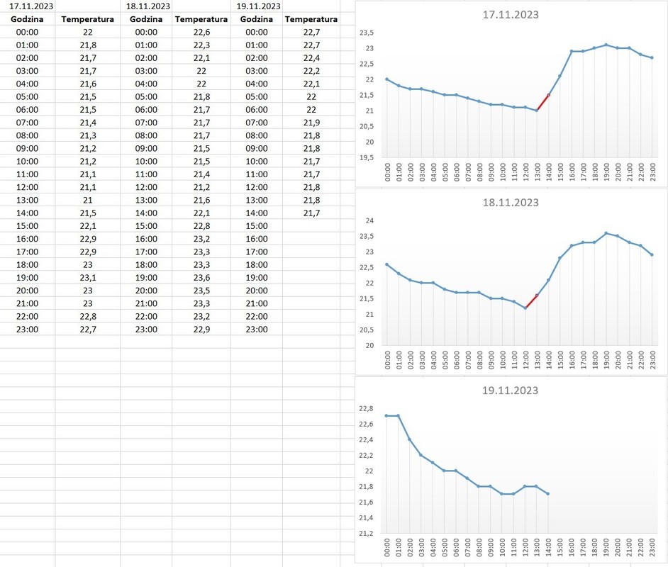 Wracam do tematu bo sporo prac już zakończonych z sukcesem 🙂 Dom docieplony 20 cm grafit, wszystkie okna wymienione na nowoczesne 3 szybowe o Uw poniżej 0.9. Dach już był wcześniej docieplony, a w przyszłym roku jeszcze ocieplam strop nad nieogrzewaną piwnicą 10 cm grafitem. Zresztą wszystko opisywałem wcześniej też tutaj Dobór grzejników do nowej instalacji C.O i kotła gazowego kondensacyjnego W każdym razie już teraz jestem w szoku jak ciepło jest w domu praktycznie tylko przepalając w kopciuchu raz dziennie. Jest jeszcze stara instalacja CO na grzejnikach żeliwnych i rurach stalowych, na piecu miarkownik ustawiony na 60 stopni a w domu w niektórych pokojach temp. pomieszczenia potrafi dojść do 24-25 stopni bo nie mam żadnych termostatów na grzejnikach itp. Zresztą rzućcie okiem na dołączony wykres temperatur z ostatnich 3 dni. 40 cm grube mury z pełnej cegły ocieplone 20 cm grafitem robią swoje. Nagrzane popołudniowym przepalaniem w kopciuchu (czerwony kolor na wykresie) trzymają komfort w domu do popołudnia następnego dnia. Wręcz powiedziałbym, że jest za ciepło bo domownicy są raczej zimnolubni i przyzwyczajeni do temperatur 19-20 stopni, a nie tak jak teraz... Reasumując warto było robić termomodernizację, szkoda tylko że tak późno a nie z 10 lat temu... W przyszłym roku czeka mnie jeszcze wymiana kopciucha na gazowy kondensacyjny (prawdopodobnie Immergas Victrix 12 X TT 2 ErP) i modernizacja instalacji CO. Tutaj jeszcze mam dylemat, bo wiem że to niewiele da i na żeliwniakach na pewno też kondensat bardzo dobrze będzie działał. Ale planuję w pokojach gdzie się najwięcej czasu przebywa zainstalować 3 płytowe Purmo C33 600x1600 wykorzystują do tego wnęki w których aktualnie są żeliwne. Ich o wiele większa moc pozwoli grzać niższymi temperaturami oszczędzając paliwo. Mam tylko wątpliwości co do zalecanego grzania ciągłego kondensatem, bo patrząc teraz jak wolno spada temperatura w budynku w ciągu doby gdy na zewnątrz jest temp. między -1 a + 2 (ostatnie 3 dni) to aż się prosi grzać cyklicznie np. w godz. 13-18 a potem korzystać dobrodziejstw dużej pojemności cieplnej ścian. Co o tym sądzicie? Pozdrawiam
