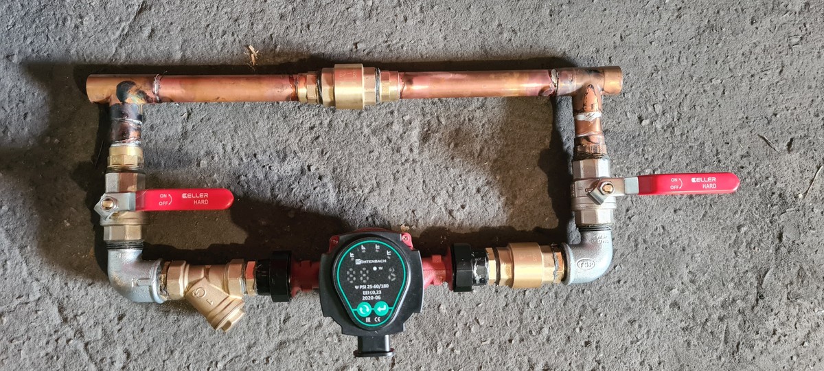 Ja zamontowałem coś podobnego w poziomie na powrocie z zaworu 4d+ posiadam pompkę CO na wyjściu na dom również z obejściem z zaworem różnicowym. Stara instalacja przed przeróbkami działała grawitacyjnie z kopciuchem, a teraz z piecem na ekogroszek jak braknie prądu to też powinna- mowa o przepalaniu w tym przypadku na ruszcie awaryjnym. Tylko dla tego awaryjnego przepalania zrobiłem obejście pompy na powrocie. Zanim pompa na powrocie się załączy przy 40 stopniach to powoli grawitacja grzeje powrót, pompa CO załącza się przy 50 stopniach, więc grawitacja działa skoro przy wyłączonych pompach grzeje powrót. Wyjście na dom i powrót z 4d CU 28, zawór 4d 5/4 i zasilanie z pieca do zaworu 4d też 5/4. -