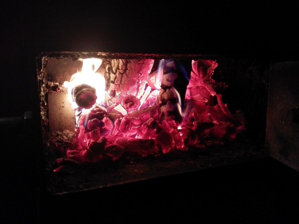 Po przerusztowaniu i opadnieciu zaru zaczelo sie palić. Mialem blache 10x15 na ruszcie wiec to nie naljepszy pomysl.to nie bylo ciagle palenie tylko 2 godziny rozpalania na ciepla wodę bez C. O. Ciąg taki ze wciaga drewnowegielki do wirnika.