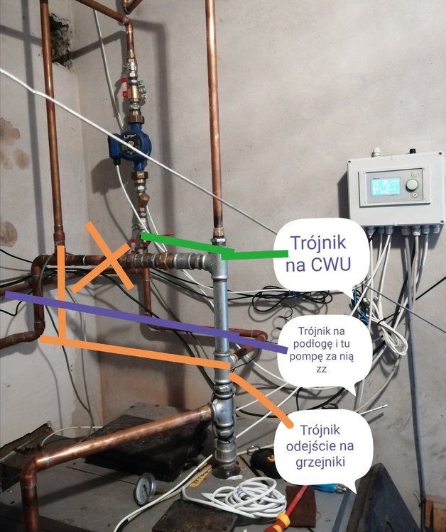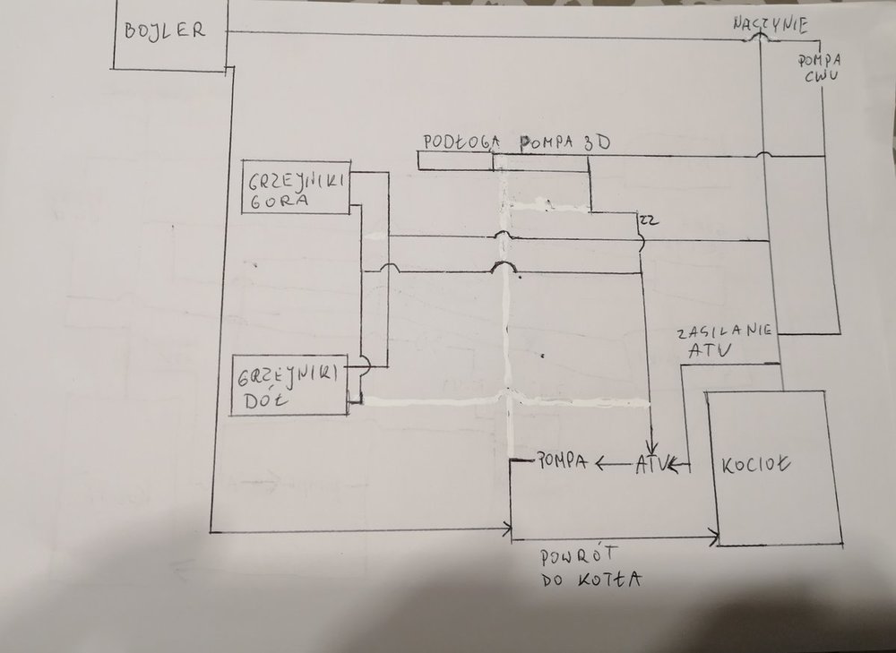 Sytuacja wygląda następująco: gdy pompy wszystkie chodzą czyli kotłowa, CWU i podłoga wtedy grzejnik nie grzeje tak jakby wszystkie pchaly w jeden obieg podłogi najbardziej a reszta nie idzie. Czyli tak jak pisał @samborpodłoga pcha w kotłowa i idą na podłogę a na CO chyba nic a wczoraj jak zakrecilem i pisałem, że nic nie daje zakrecenie podłogi chodziła pompa CWU. @gmaj22pisał, że źle jest wpiete zasilanie CWU bo powinien być nad CO i podłoga i chyba miał rację. Jak możecie powiedzcie czy mogę teraz pierwszy trójnik byłby zasilanie ATV drugi zasilanie grzejników trzeci i teraz czy moge pompę podlogi wrzucić na zasilanie podłogi za znia ZZ. I czwarty dałbym CWU wtedy nie było by może problemów z tym, że pompy pchają w siebie? Jeszcze dodam, że jak chodzi podłoga to ta sama sytuacja z CWU jest, słabo grzeje bojler. Czy dać pompę na grzejniki oddzielna? Ale tyle pomp? W sumie leży w domu.