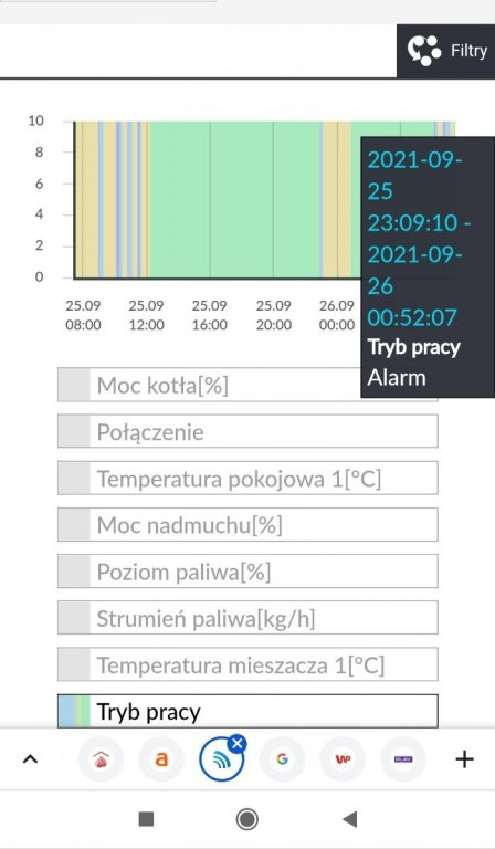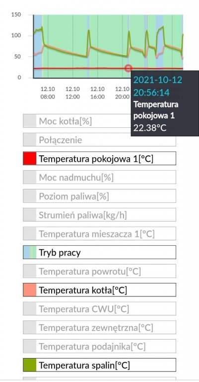 @Kordjanoi przewód innego koloru. Jak tak się dzieje a wszystkie powyższe porady są ok czujka do wymiany. Kilka fotek z pracy mojej przeróbki. Powiem wam, że kocioł stał się bezobsługowy a spalanie mnie satysfakcjonuje mega. Bardzo mała ilość rozpaleń = niskie spalenie kilka zmian w ustawieniach, które spowodowały o to takie wykresy. PS. Przypominam śmiecuich a w nim palnik kipi 20kw. -
