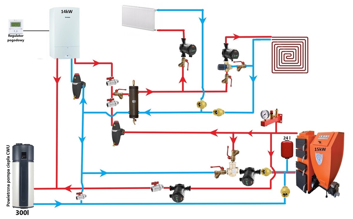 święta racja! Dziękuję, że zwróciłeś na to uwagę. Faktycznie tak jest. Nie przyjrzałem się dobrze temu Junkersowi. powrót CWU był zasłonięty przez rurkę gazu o odpływ skroplin. Przepraszam. Poniżej na schemacie zmieniłem podłączenia na istniejące w rzeczywistości. Piec z podajnikiem jest dołączony trójnikami do wcześniej istniejącej instalacji CO i CWU. -