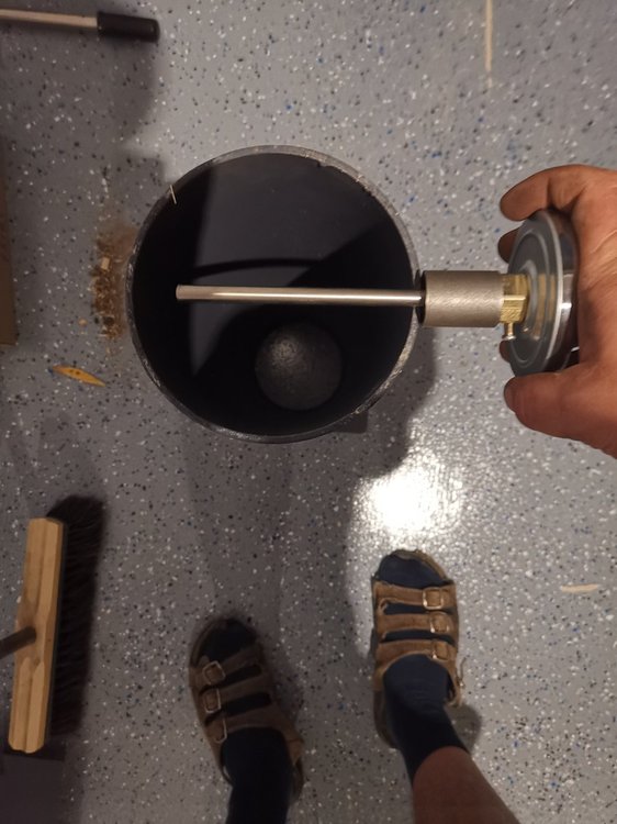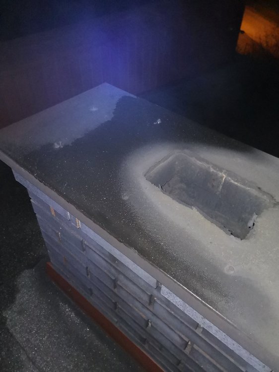 Mój wymiennik po tygodniu palenia: Na chwilę obecną przepalamy. Wczoraj wlazłem na dach w celu zobaczenia jak wygląda komin: W środku wygląda normalnie - natomiast zastanawia mnie trochę ta woda na obróbce. w tym momencie temp. spalin była 250oC. W kociołku paliło się trochę drewna i węgla.
