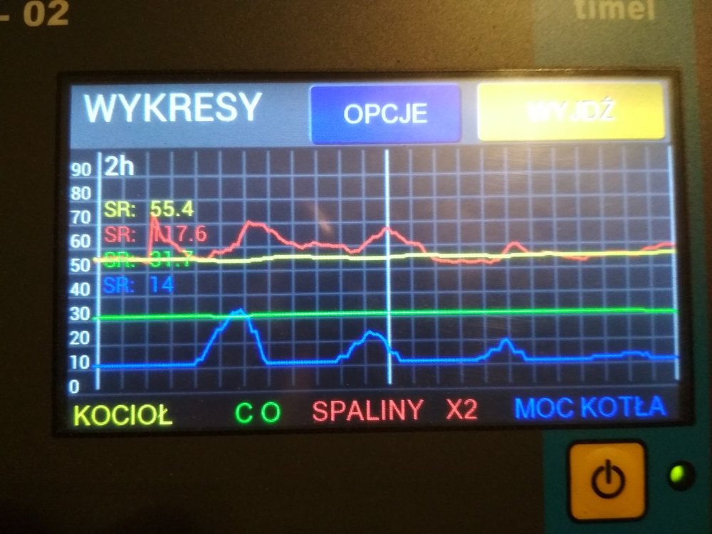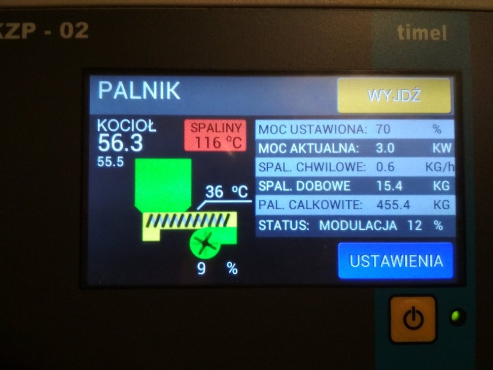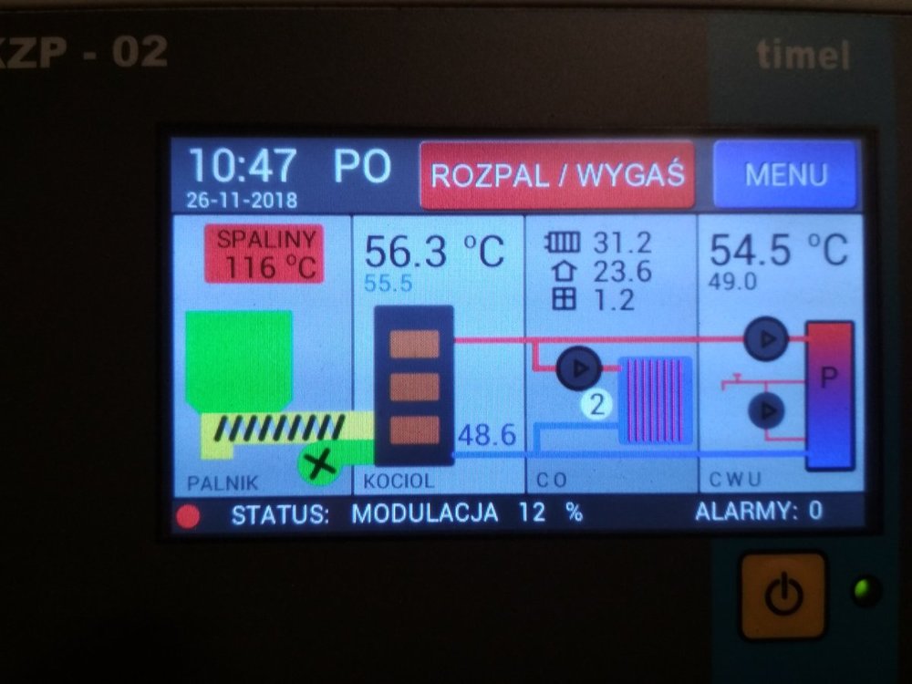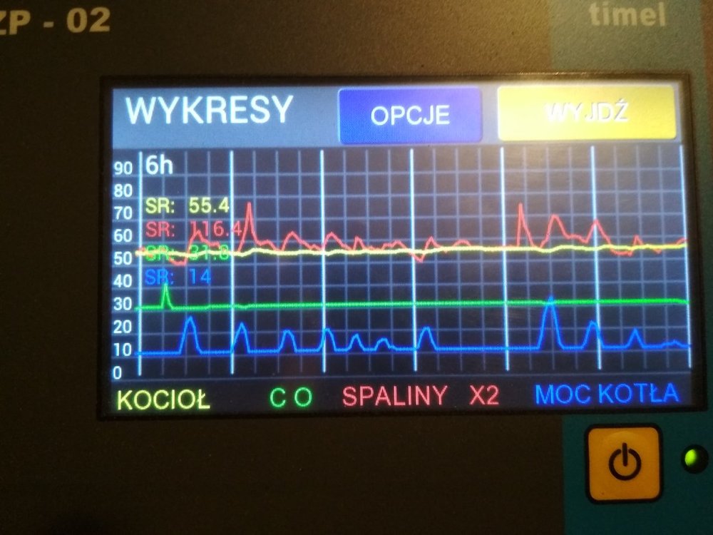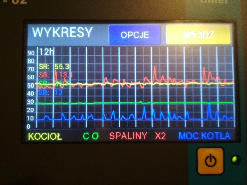 Witam, mam pytanie do bardziej doświadczonych użytkowników SKZP-02. Ogarnąłem trochę swoją instalację i rozpocząłem nowy sezon ze sterownikiem SKZP. Kocioł Cichewicz futura Econo mini 16kW (ale ten palnik co mam był w kotłach do 25kW) Dom ok.150m2 (w tym garaż 18m) ocieplony 10cm styropianu, podłogówka 4 obwody (przykryzowane na powrotach)- PARTYZANTKA wpięta tak jak grzejniki - do poprawienia po sezonie zamontuje zawory RTL). Reszta ogrzewania na grzejnikach. Aha na tą chwile wszystkie termostaty otwarte na maksa ale woda w obiegu ma ok.30 stopni - wtedy podłogi są ok. 1. temp. zadana 50 *C - korygowana czujnikiem pogodowym 2. pompa CWU włączona na stałe - daje rade utrzymywać deltę temperatur ok. 9-10*C 3. potencjał podajnika obliczony wyszedł 14.4kg/h 4. węgiel to ruski groszek z energo sp.z o.o. niby 24-26MJ - suchy 5. dmuchawa WPA06 - ustawiona na 8-20 (przesłona otwarta na maksa) 6. modulacja 12%-70% - póki co wiecej niż 50% chwilowo nie było. pytanie 1 - wykresy modulacji wyglądają niby ok ale te płaskie pola wyglądają dziwnie jak takie pseudo podtrzymanie ? pytanie 2 - nie mogę sobie poradzić z palnikiem, robią mi się spieki tzw. "popcorny", które rozpadają się po dotknięciu pogrzebaczem, kopczyk niby jest ok ale dopiero ustawienie mocy 25KW poprawiło sprawę. Z przeczytanych postów wywnioskowałem, żeby ustawić 16KW - a nie 25, obniżyć kaloryczność paliwa i dobrze doregulować powietrze. tylko czy jest sens schodzić jeszcze z obrotów, które i tak wyglądają na niskie ? -
