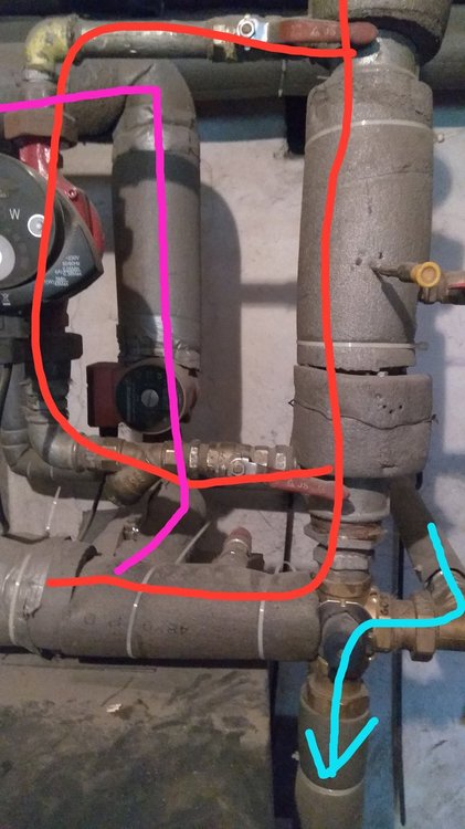 A więc tak : pojemność pieca 92 litry, zawór 4d , oraz rury główne 1 1/2 cala - stalowe zawór na razie bez siłownika, sam ręcznie ustawiałem w celu dogrzania powrotu kotła grzejniki panelowe, CWU podłączone przed zaworem 4d, na obu obiegach zawory zwrotne, pompa CO za zaworem 4d Na zdjęciu : czerwony - CO, fioletowy - CWU, niebieski - powrót -