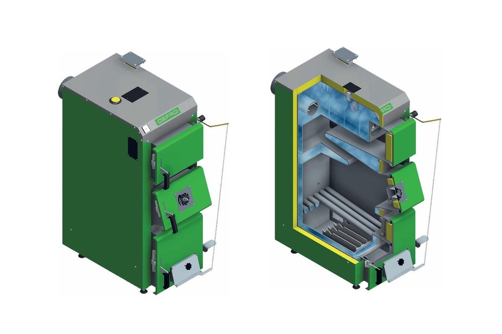 Na sezon zwykle mi idzie ~10m drewna i ~3tony węgla. A kocioł wygląda w przekroju ta jak na załączonym rysunku - posiada płaszcz dookoła i ruszt wodny. Więc montaż palnika raczej możliwy tylko w drzwiczkach dolnych - nad rusztem wodnym.