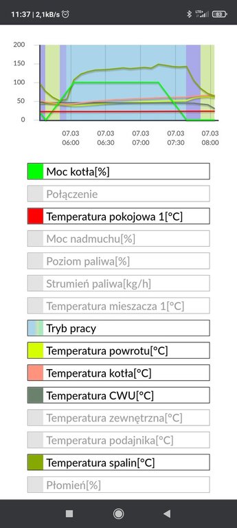 Witam. Co do spalania to z ostatnich 9 dni (26.02 - 06.03) to zasypiałem 10x20 kg rano 26.02 i potem 07.03 też rano. Czyli łatwo wyliczyć poszło 22,22 kg na dzień. A pogodę każdy widział w tym czasie. Temperatury w domu dalej 23 i 21.8 noc. Przy czym w weekend mam cały dzień 23, bo w dni robocze obniżenie nie tylko noc, ale i 8-14 w dzień. Myślę że na te metry nie jest źle. Jak dobiję do 16 czerwca to pokażę rozkład zużycia przez cały rok. Każdy zasyp zasobnika mam zanotowany. Załączam aktualny wykres pracy palnika, przy czym jak mam wyczyszczony piec to temperatury spalin spadają mi o jakieś 15 stopni - do max 130.