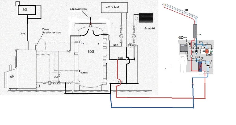 Witam wszystkich Chciał bym założyć sobie kolektory słoneczne 3 panele do grzania C.W.U, posiadam bojler nierdzewny poziomy 120l z jedno wężownicą C.O i bufor nierdzewny 800l bez wężownicy, zastanawiam sie jak by to podłączyć żeby dobrze działało 1 opcja przez wymiennik płytowy 2 opcja kupić nowy bojler 300l z dwoma wezownicami zdjęcie przedstawia schemat mojego podłączenia schemat jak to widzę z wymiennikiem płytowym Proszę was o rade Pozdrawiam