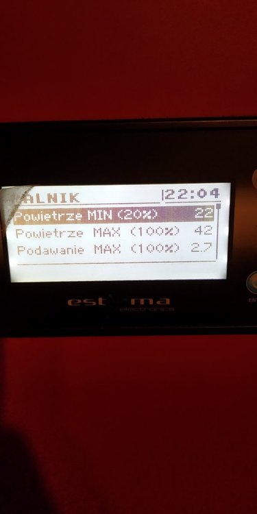 18. Podawanie od 2,7 do 3,3 zalezy od mrozu Powietrze min. 18 max. 42 Moc min 45 max 100 Spalanie mam okolo 15kg na dobe co wydaje mi się duzo ale nie mam jeszcze ocieplonych scian tylko 25 cm welny 0.039 na stropie.