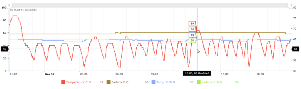 Tak, ja mam taki sam. A ochronę powrotu masz wyłączoną? Dobrze by było abyś podała więcej parametrów ustawień i czy masz jakiś zawór założony? Czujnik pogodowy masz tez zamontowany? Tu jest pełna lista parametrów, najlepiej jak spiszesz je wszystkie: II.3. Temperatura zadana CO II.4. Temperatura zadana CWU II.6. Tygodniówka (sterowanie tygodniowe) II.7. Przerwa podawania II.8. Alarm temperatury II.9. Siła nadmuchu II.10. Tryby pracy pomp II.11. Przerwa podtrzymania II.12. Wentylator w podtrzymaniu II.13. Obniżenie pokojówki II.15. Informacja o programie III.1. Zawór 1. Stan zaworu 2. Temperatura zadana zaworu 7. Typ zaworu 8. Pogodówka (sterowanie pogodowe) 9. Ochrona powrotu 10. Urządzenie regulatora pokojowego III.4.Temperatura załączenia pomp III.5. Histereza kotła III.6. Histereza CWU III.7. Regulator pokojowy III.10. Podajnik w trybie auto III.11. Nadmuch w trybie auto III.12. Pompa podłogowa III.13. Pompa cyrkulacyjna -