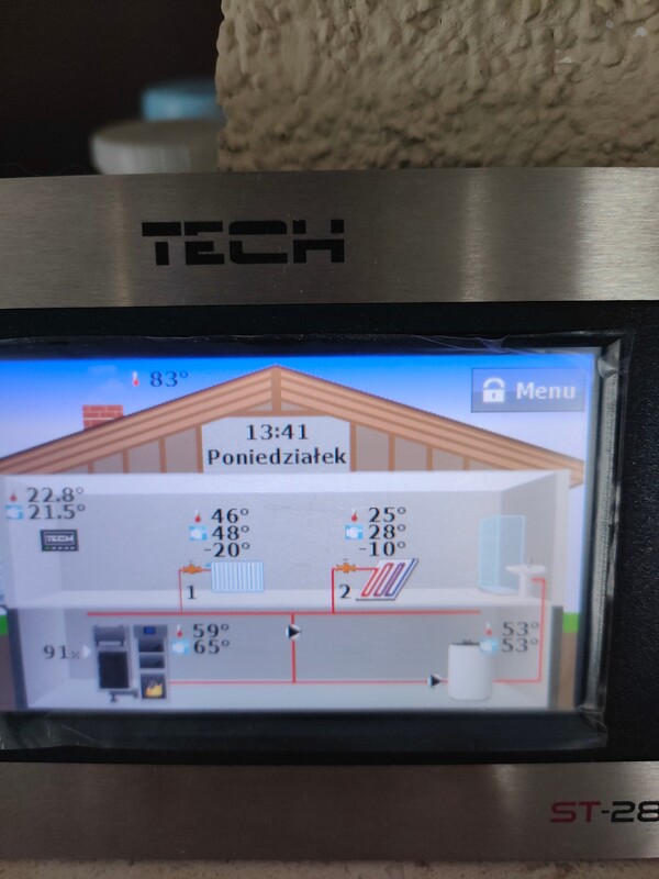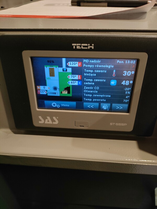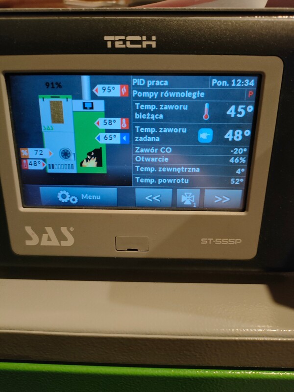 Nastawy pieca i sterownika pokojowego SAS Bio Compact PLUS 10kwgastek odpowiedział(a) na gastek temat w Kotły pelletowe Kurcze nie rozumiem twojego toku myślenia @lenas1, po to stosuje się sterownik pokojowy aby komfort temperaturowy występował i aby piec wiedział w pid jak ma modulować swoją mocą do tego jak się rozkłada temperatura w domu. Abstrahując od tego co napisał @lenas1, znalazłem błąd w ustawieniach. Mianowicie w zaworze do CO i w zaworze do podłogówki sterowanie zaworów występowało z sterownika pieca przestawiłem na sterowanie z pokojówki, dla potomnych znajduje się to Menu ->Menu instalatora -> Ustawienia zaworów i tu Zawór Wbudowany 1 (to zawór pompy CO) i Zawór Wbudowany 2 (zawór od pompy podłogowej) i ja mam załączony profil grzania z czujnika pogodowego bo go mam i w opcji Regulator pokojowy zmieniłem z Sterownik pez pokojówki na opcję Regulator Tech RS. Co zaowocowało tym że mogę ustawić obniżenie temperatury na zaworach które mają wystąpić gdy zadana temp na pokojówce 21,5 zostanie osiągnięte. Oczywiście jest to w celu by był delikatny odbiór ciepła z kotła i aby pokoje się nie przegrzewały. Ale czy to wystarczy do tego by piec pracował w czuwaniu? Właśnie grzeje więc jak zostaną osiągnięte wartości dam znać. No chyba że ktoś zna rozwiązanie problemu to proszę o pomoc. No i piec przebił 5st od zadanej przeszedł w nadzór 🙂 nie wyczyścił palnika i nie dopalił resztek czyli zostało tylko dobrze ustawić nadzór by w palniku się nie wygasiło. I ustawić dobrze obniżenie na pompie co i podłogówki.