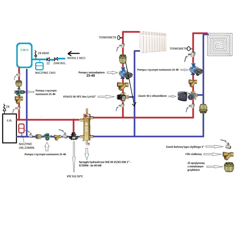 Cześć forumowicze. Czeka mnie modernizacja kotłowni z śmieciuszka na pelleciaka SAS Bio Compact PLUS 10kw. Mam kilka pytań co do wykonania instalacji. Mianowicie instalacja będzie oparta na sprzęgle hydraulicznym oraz grupie pompowej. I tutaj pytania 🙂 jak to powinno być wykonane aby to było efektywne i bez problemowe. Czy grupa pompowa powinna wyglądać następująco: 3 tory: 1 tor Ogrzewanie grzejnikowe z głowicami termostatycznymi: Pompa bez mieszacza. 2 tor Ogrzewanie podłogowe rozdzielacz bez Rotametrów 7 obwodów: Pompa z mieszaczem 3 tor CWU: Pompa bez mieszacza no i 4 pompa przed sprzęgłem na obiegu kotłowym wydajność pompy równa wydajności pomp na grupie pompowej. też słyszałem o rozwiązaniu że CWU powinno być wpięte w obieg pompy kotłowej, jak to w końcu powinno być ?