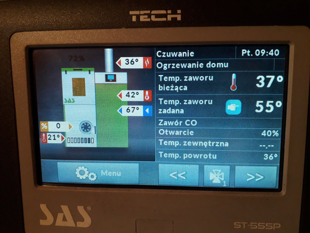 Dzień dobry. Specyfika instalacji: Dom 110m2 50/50 podłoga i grzejniki. -Piec SAS Bio Compact PLUS 10kw (zainstalowany najmniejszy jaki był od SASa według ciepło właściwe budynek wymaga 8kw) -Sterownik na piecu Tech ST-555P -Regulator pokojowy ST-280 Instalacja wykonana na sprzęgle i grupie pompowej według poniższego schematu. Tylko nie ma VTC 55st. Ale i tak powrót zawsze pięknie dogrzany. Obecna nastawa sterownika na piecu to praca w PID, współczynnik mocy kotła ustawiona na 80%, pid nadzór a tam ustawienie tryb wygaszania jest zaznaczone na Wyłączony. Oczywiście jak sterownik pokojowy osiągnie temperaturę to piec sygnalizuje następujące stany PID praca -> dopalanie -> Czyszczenie -> nadzór. I tutaj jest coś nie tak bo gdy pokazuje nadzór to w palniku 0 peletu 0 ognia czy żaru. No i według nastaw powinien utrzymywać temperaturę kotła a w tym rozumiem że mają mu pomóc opcje Menu instalatora -> PID nadzór -> Czas podawania 4sekundy, Przerwa podawania 9 minut, czas pracy wentylatora 10 sekund, obroty wentylatora 30%. No i tutaj pies pogrzebany bo te nastawy nie pracują pomimo trybu nadzór, nie ma podawania co 9 minut itp. No i wypadkową tego jest problem dużego spalania pelletu. Wsypuję do kotła 105kg wystarcza to na 8 dni czyli średnia 13,125kg na dzień. Dużo... Przesiadłem się z kopciucha a tam dominowała specyfika rozpal kocioł, nagrzej dom wygaś kocioł. W pelecuaku z tego co doczytałem kocioł powinien sobie cały czas pyrkać. A niestety obecnie u mnie działa to tak że dom dochodzi do 21.5 kocioł się wygasza i ponownie rozpala gdy temperatura spadnie o 0,9st czyli 20,6. Niestety piec wygaszony i dużo czasu jak i opału trzeba by ponownie kocioł rozchulać (5kg) oczywiście włączenie wyłączenie pracy 21,5 wychodzi z nastawy sterownika pokojowego Techa bo tam mam zadaną 21,5 i histereze 0,9st. Z innych nastaw to 65 zadana na piecu. I pompy równolegle. Aaaa no i na pewno pomocne będzie jak jest ustawiony w kotle regulator pokojowy: Menu Instalator -> Regulator pokojowy: Regulator pokojowy -> Tech RS. Obniżenie pokojówki -> 15st. Sterowanie Pompą CO -> załączony. Regulator Tech RS -> załączony. Pomoże ktoś okiełznać smoka ? -