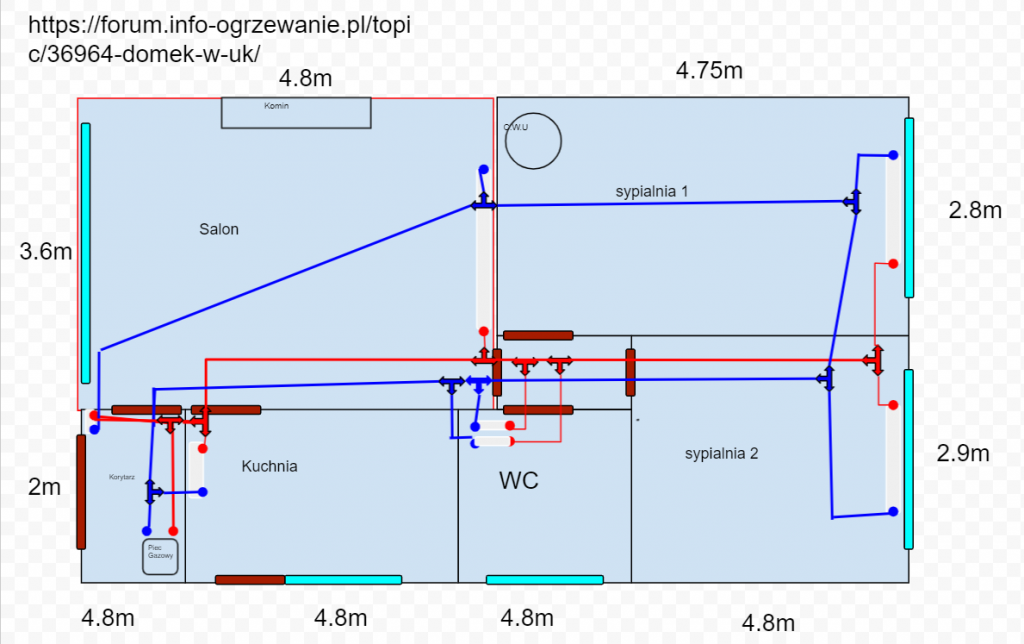 Przepraszam z tak późno odpisuje nie dostałem powiadomień. Sambor jak zawsze dziękuje za odpowiedz twoje rady sa zawsze mile więzień. Rozumiem z grzejniki co posiadam są za małe. Moc grzejników brałem z katalogu https://www.toolstation.com/ Co do mocy do potrzebnej na pokoje jest to brane z kalkulator ze strony www.bestheating.com dodam ze w UK nie ma szalejących mrozów , dlatego kalkulator liczy mniejsze grzejniki (tak myślę, jak). Piec będzie 2 fikcyjna np Ideal Logic C30 << takie są popularne w UK oraz BAXI i Viessmann. Jaka jest temperatura wody z pieca gazowego? Teraz piece przecież mają modulacje mocy. Myślę ze grzeją najpierw pomieszczenie z mocą i temperatura maksymalna a później schodzą z mocą i temperatura do utrzymania temperatury zadanej w termostacie pokojowym oblicznia dla mocy 90W/m2 szerokosc dlugosc wysokosc m2 salon 4,8 3,6 2,2 17,28 1555,2 pokuj ali 4,75 2,8 2,2 13,3 1197 sypialnia 3,2 2,9 2,2 9,28 835,2 lazienka 2 2 2,2 4 360 kuchnia 3,15 2 2,2 6,3 567 korytaz 1,3 2 2,2 2,6 234 52,76 4748,4