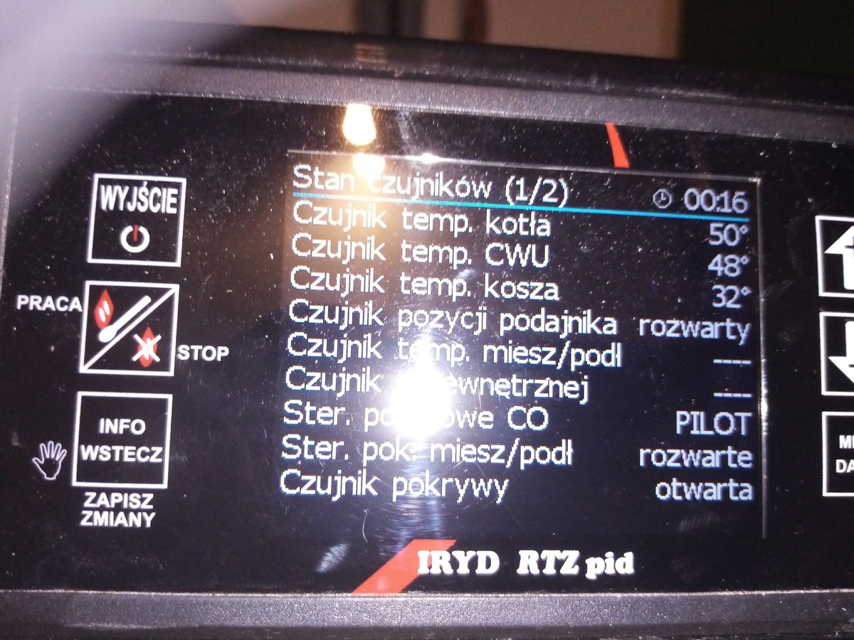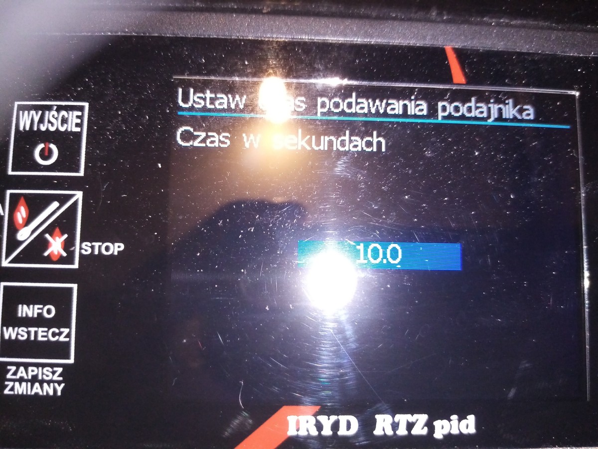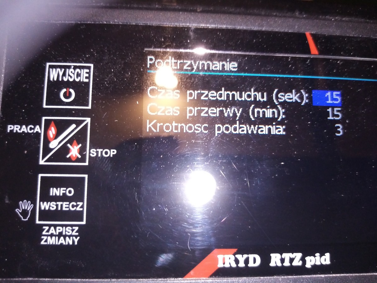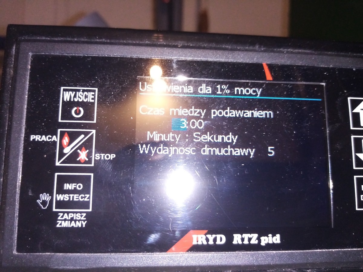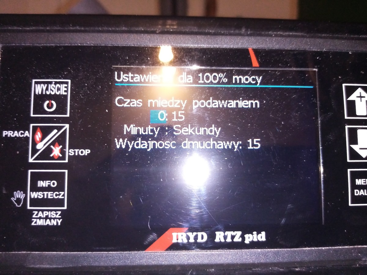 Ustawienia mam w tej chwili Moc 100% Przerwa w podawaniu 15sekund Dmuchawa 15bieg Moc 1 % Przerwa w podawaniu 3 minuty Dmuchawa 1bieg Podawanie mam ustawione 10sekund Zmieniałem np mniej żeby podawał a częściej i to samo sterownik ma iryd pid -
