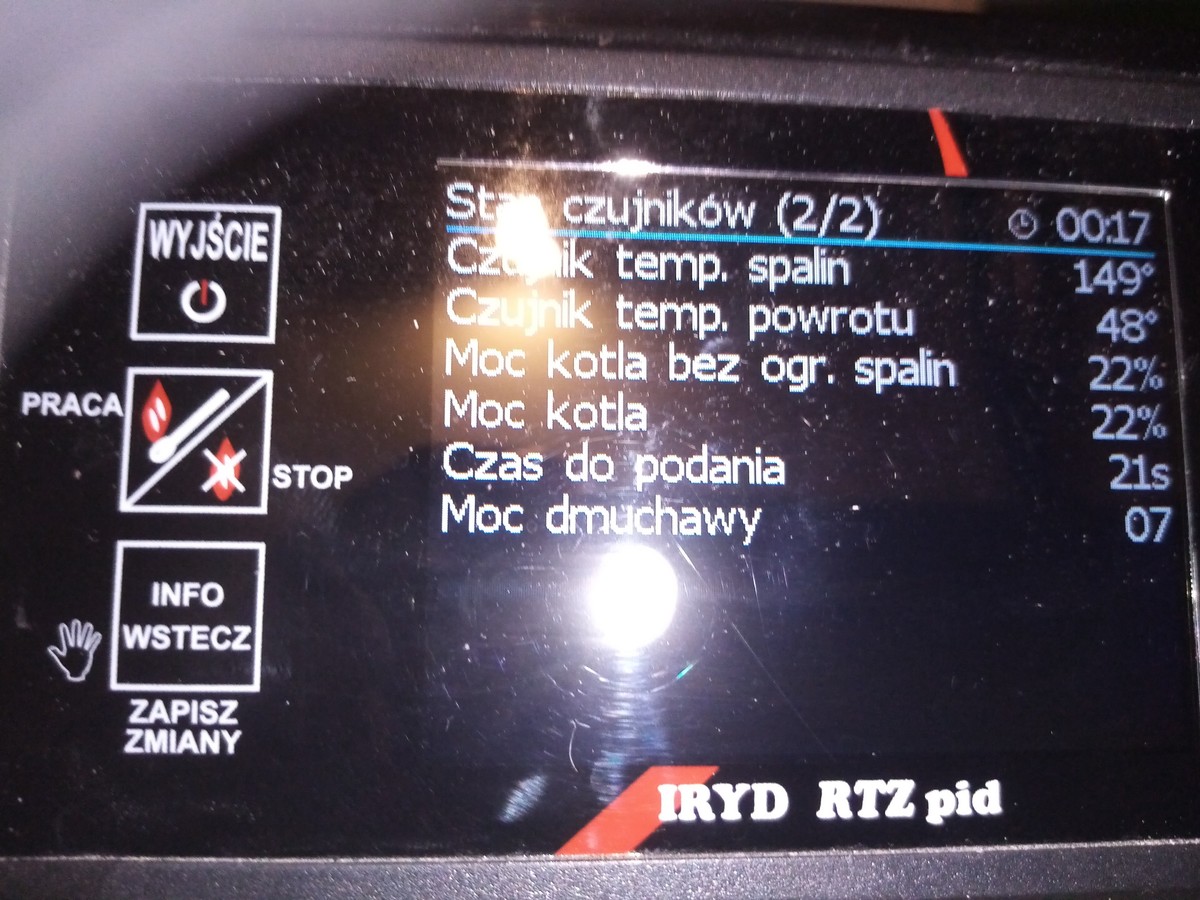 Na mocy 22% pracował w tej chwili kocioł pracuję 17% temperatura spalin 134c chwilo podnosi się o 2c ale to może być ze jak kocioł podaje to nadmuch zawsze na czas podawania podnosi się do 20 biegu -