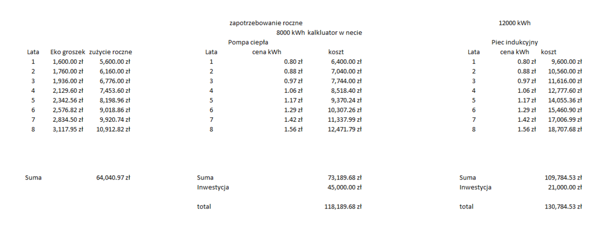 przy zakupie kotła indukcynego mamy na rok ok 9000 PLN czyli ok 11000 kWh (6500 PLN koszt ekogroszku + 2500 z różnicy w inwestycji na rok).