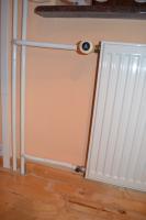 Grzejniki Purmo, w każdym zawór termostatyczny Danfos i na dole zawór zamykający.
