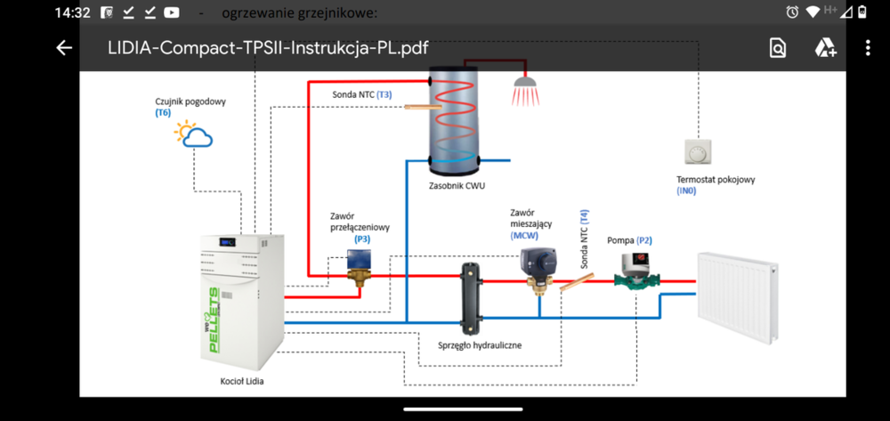 Przyszedł czas na uruchomienie ogrzewania i okazało się, że palenie na regulatorze pokojowym nie jest dla mnie do końca ok. Głowice termostatyczne nie reagują tak szybko jak mogłoby się zdawać i efekt jest taki, że pomieszczenia dogrywają się zbyt mocno, kocioł nie dochodzi do temperatury bo wcześniej dojdzie temperatura na regulatorze pokojowym. Kocioł się wygasi, pompa przepchnie resztę wody przeyinstalacje i ja wychłodzi. Histereza na regulatorze ustawiona na 1*, żeby kocioł się nie włączał co chwilę. Nie odpowiada mi to, bo kocioł pędzi na max mocy, rozpala się (a będzie częściej, bo będzie zimno) często, spala więcej paliwa . Chce dojść do sytuacji, kiedy kocioł pracuje na mocy minimalnej, grzejniki pracują nie na maxhmalnej mocy, w domu nie ma wahań temperatury. Na bufor nie mam miejsca, więc to rozwiązanie raczej nie jest brane pod uwagę, poza tym Lidia może modulować moc, to nie kocioł na węgiel. Pomyślałem, że do tym pomysłem będzie zastosowanie sprzęgła, zaworu mieszającego 3d z siłownikiem i spiętego z czujnikiem pogodowym, który będzie regulował ilość ciepła jaka idzie na grzejniki. Niech mnie ktoś mądrzejszy oświeci czy takie rozwiązanie będzie dawało pracę ciągła na niskiej mocy czy jest to ślepy zaułek. Chodzi mi dokładnie o instalacje jak na schemacie. W domu są tylko grzejniki. -