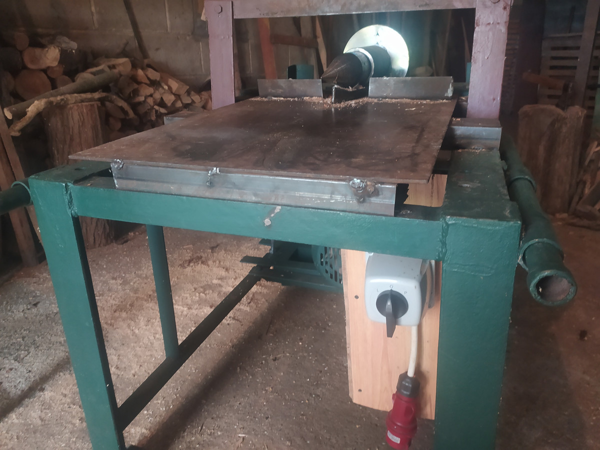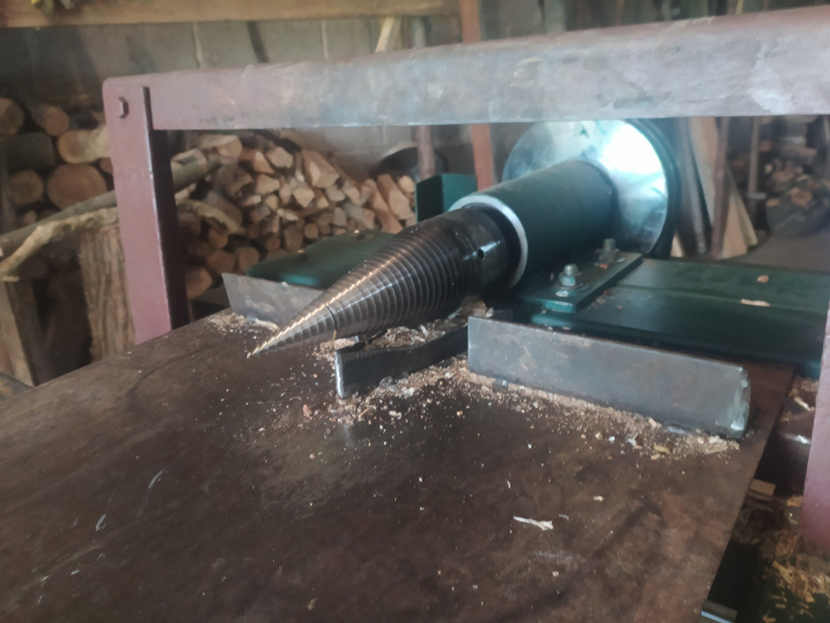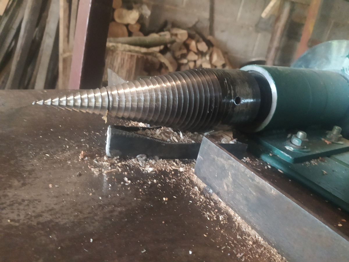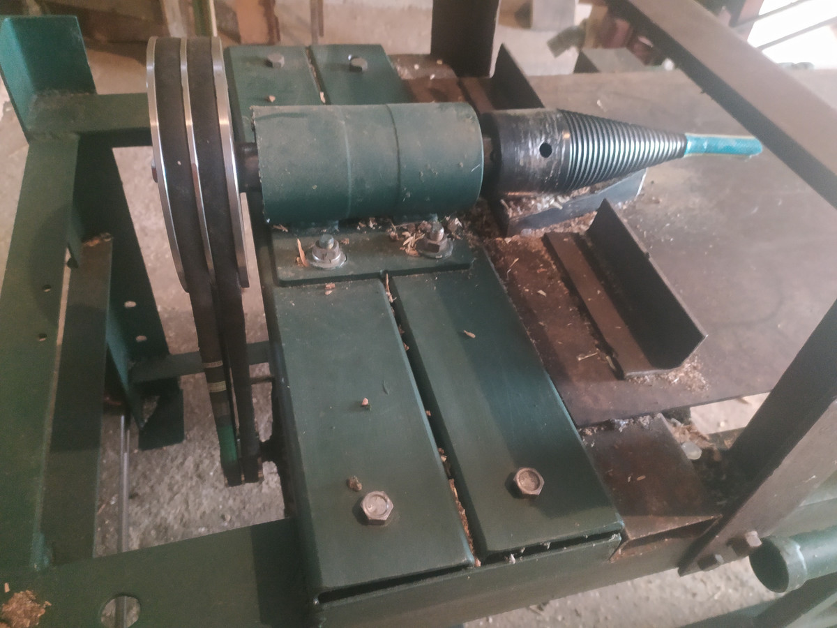 Wałek ze świdrem jest przykręcony do dwóch profili 10x5,a te przykręcone do stołu. Spawanie ich do stołu nie ma sensu, przy łupaniu sękatego,węźlastego drewna popeka Łuparka w czasie prób uległa modyfikacji,podwyższyłem blat (blacha stalowa 4mm),teraz czubek świdra do blatu to ok 8-9 cm. Jeśli jest wyżej, trzeba używać więcej siły,jest niebezpiecznie i łatwo drewno się wkręca pod świder,mimo klina. Klin powinien być rozszerzony,a między klinem a świdrem 2-3 cm. Dodatkowo wspawane są kątowniki mniej więcej w połowie świdra po bokach,a także kątownik-ogranicznik nad świdrem. Ogranicza to zakleszczenie klocka i utratę kontroli. Przez to trzeba większe klocki łupać na 2 lub 3 siekierą,ale przecież i tak trzeba to zrobić,chyba że ktoś chce dźwigać na stół duże kloce - ale wtedy po co łuparka, świder ma oszczędzać kręgosłup!. Te ograniczniki z kątowników nie pozwalają się też zakleszczyć świdrowi i 9/10 razy mogę zdążyć z wyłączeniem maszyny i tedy obroty prawe i odkręcam klocka. Kiedy nie było ograniczników,na dębie świder zakleszczał się często,a włącznik obrotów lewo-prawo był psu na budę. W tym wypadku zalecam używania do odkręcenia świdra dużej żabki (żadnej siekiery -utrącisz czubek świdra) - odkręcamy parę razy żabką i wtedy można już użyć włącznika L-P. Te filmy z utuba to lipa,90% z nich ludzie łupią sosnę i olchę, co to za problem nawet jedną ręką siekierą machnąć, gorzej z dębem czy osiką,wiązem. PS. Łupanie bardziej sękatych to mit. Lepiej odłożyć i pociąć piłą. Przynajmniej w moim zestawie,byc może przy kole zamachowym 300 duże/120 małe i silniku 5.5 kW pójdzie,nie wiem, montowałem z tego co było. 900 obr/min to za dużo, świder na wale to chyba do sosny i olchy dobry,poza tym za wysoko do twardych pniaków. Silnik najlepiej 1400/1430 obr i redukcja kołami pasowymi do 500-600 obr.