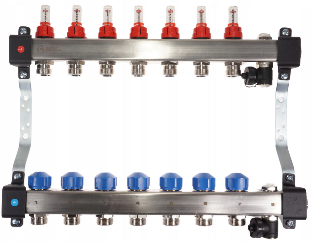 Rozdzielacze Kan-Therm InoxFlow UFS (wersja z opcją siłownika wzięta na wyrost). Jak pisałem, na belce ciepłej wody mam odpowietrznik automatyczny zamiast zwykłego.
