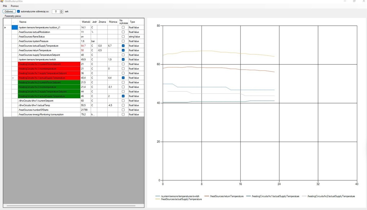 W chwili wolnej stworzyłem prosty program pod Windows do odczytywania parametrów pieca co x sekund. Pozwala to na bieżącą obserwacje zmieniających się parametrów pieca. Program komunikuje się (bezpośrednio, nie przez serwery Buderusa!) z modułem KM100 lub KM200 (a i może KM50). 1. Program można pobrać z tego miejsca: plik1: http://www.gbbsoft.pl/!download/GbbBuderus/setup.exe plik2: http://www.gbbsoft.pl/!download/GbbBuderus/GbbBuderusSetup.msi Oba pliki umieścić w jednym katalogu (dowolnym, może być np: pulpit, po instalacji można je usunąć). Uruchomić setup.exe 2. Po zainstalowaniu programu można go uruchomić. 3. W parametrach w pierwszej zakładce wprowadzić: adres IP modułu KM200/KM100, hasło z modułu oraz ustawione własne hasło dla tego modułu 4. Następnie w drugiej zakładce nacisnąć przycisk "Pobierz/Odśwież dane", jeżeli adres IP i hasła zostały poprawnie ustawione, to program pobierze wszystkie dostępne parametry (trwa to ok. 45 sekund) 5. W kolumnie 'Pokaż na głównym ekranie' zaznaczamy cechy, które chcemy obserwować. W kolumnie 'Kolejność' można cyframi 1,2,3,4,... określić kolejność w jakiej mają być umieszczone te cechy na głównym ekranie. 6. Po zamknięciu parametrów na głównym ekranie możemy zaznaczyć 'automatycznie odświeżaj co', co spowoduje odświeżanie danych z przerwą co x sek.