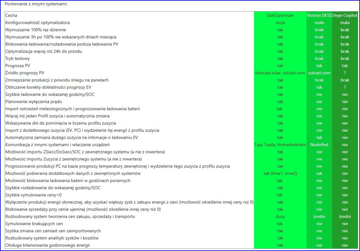 GbbOptimizer inwerterów hybrydowych: https://gbboptimizer.gbbsoft.pl/ Wersja 16.7 - Nowa opcja optymalizatora opartego na cenach: Nie pobieraj prądu z sieci, gdy temperatura na zewnątrz wyższa niż X (dla ochrony przed przegrzaniem) -