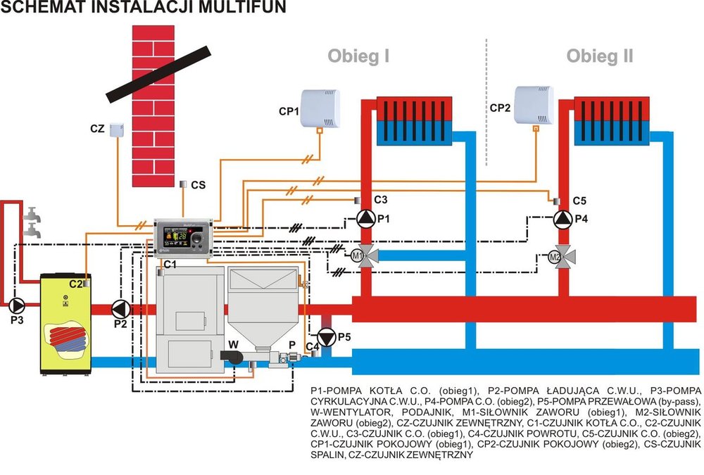 Sprzęgło+ pompa na krótki obieg, 2 zawory 3-drogowe z automatem na co1 i co2, pompa CWU, czujnik temperatury zew, termostaty pokojowe do co1 i co2 , układ zamknięty