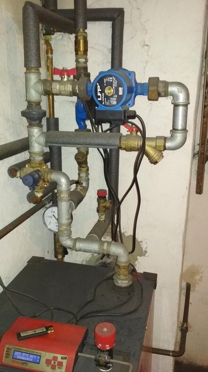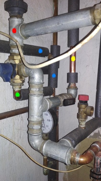 Koledzy pomóżcie. Mam problem z grzaniem ciepłej wody użytkowej. Na rurce z kolorem żółtym (uderzenie na cwu) była wcześniej pompka, która obsługiwała cwu, pompka skończyła życie na chwile przed wyminą kotła, fachowiec, który wymieniał mi piec stwierdził ze pompka na cwu jest całkowicie zbędna, ponieważ do bojlera jest raptem 3 metry i grawitacja załatwi sprawę, zaufałem i tak zrobił. Efekt jest następujący, niezależnie od ustawień zaworu 4d gorąca woda zamiast iść zółtą rurą to zasuwa przez zieloną i poprzez niebieską (powrót z cwu) idzie do bojlera, grzejąc go jakby od du...strony, co daje marny efekt, woda tylko ciepła, a na kotle 70 stopni. Przez żółta rurę idzie woda z temp. nie więcej jak 40 stopni. Woda grzeje się prawidłowo tylko wówczas jak nie pracuje pompa co która pcha wodę na piętro do mieszkania (kolor czerwony). Jak sobie z tym poradzić bez spuszczania wody z instalacji i cięcia rur? Macie jakieś pomysły? Dodaje tez zdjęcie jak to wyglądało przed wymianą kotła.
