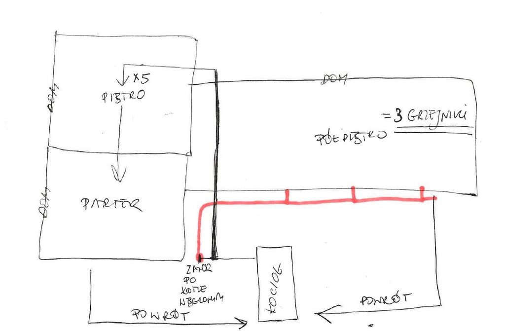 Dom z lat 80, ogrzewany peletem, instalacja otwarta , instalacja - w sensie rur- nie zmieniana, rury grubościenne o rożnych przekrojach (wiadomo, kiedyś to była instalacja grawitacyjna) Z piwnicy od kotła idzie pion na strych , na strychu odchodzą gałązki które "spadają" do grzejników w rożnych miejscach domu. W najwyższym punkcie znajduje się zbiornik wyrównawczy (na strychu) Całość działa, nie ma problemów mimo, że rury stare. Oczywiście w układzie jest pompa CO, która pyrka sobie na 1. biegu. Dom ma w uproszczeniu budowę (nie jest to typowy klocek z lat 80) - parter, półpiętro i piętro, z czego piętro i parter są nad sobą- rysunek 1. No i właśnie szykuje się do remontu/zmian stylistycznych na półpiętrze. Niestety akurat na półpiętrze rurki z CO (zasilające od gałązek) bardzo szpecą ściany w kilku miejscach- a to idą z sufitu, a to idą poziomo na ścianie . I pomyślałem sobie, czy można by dokonać takiej zmiany, która byłaby dla mnie bardzo prosta "logistycznie" ponieważ pod półpiętrem mam akurat piwnice m.in z kotłem. Tzn czy można na strychu uciąć i zaślepić tą gałązkę odpowiedzialną za zasilanie grzejników na półpiętrze, wywalić stare rurki zasilające idące od sufitów, a grzejniki zasilić na nowo jakby od dołu - w piwnicy przy początku pionu mam zawór zostawiony po kotle węglowym i prostą możliwość puszczenia zasilania do tych grzejników pod stropem piwnicy- wtedy tylko wiercę w podłodze dziury pod zasilanie pod każdym z grzejników(3x). Ze zrobieniem powrotu tez nie ma problemu bo teraz powrót z tych grzejników też jest ukryty w piwnicy. Czy to będzie działać ? czy zaburzy się jakiś przepływ i tak się nie robi? Często słyszę opinie, że jak jest pompa CO to zawsze będzie woda krążyć, ale podchodzę do tego z dystansem...