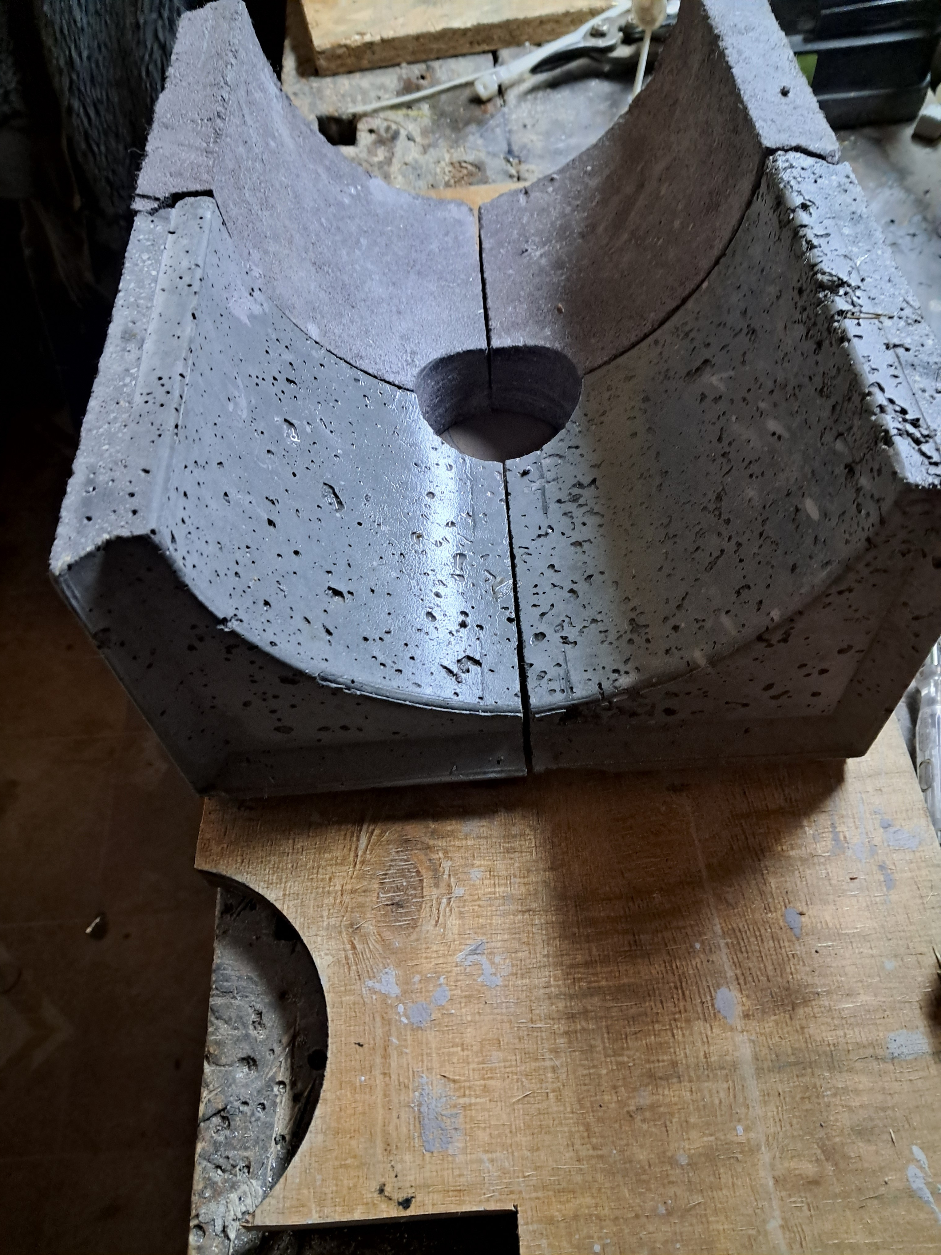 Zabawne że z @jacek8l niemal w tym samym czasie pomyśleliśmy o wykonaniu palnika opartego na zasadzie działania zwężki venturiego😀 Już od jakiegoś czasu w wolnych chwilach pracuję nad wykonaniem odlewu takiego palnika, gdzie otwory powietrza dopalającego będą umieszczone w "wąskim gardle" dla jak najlepszego mieszania gazów z tlenem już w tym tym miejscu, czyli jak najbliżej lejkowatego wlotu do palnika. Poniżej zwężenia(ale nadal całość jako monolit od wlotu po wylot) będzie odcinek bardzo dobrze zaizolowanej rury dla jak najszybszego złapania wysokiej temp i dopalenia już tam jak największej ilości gazów. Pod nią pozostanie oczywiście jeszcze prawilna komora dopalania, ale z racji że potrzebuje ona nieco więcej czasu na nabranie odpowiedniej do dopalania temp, to mam nadzieję że dopalacz rurowy będzie dzałał szybciej. Na obecną chwilę mam już wykonane rdzenie formy nowego palnika: Jeszcze od groma pracy przede mną, zwłaszcza że oprócz palnika mam zamiar opracować nową "podłogę". Podłogę której kształt w przekroju poprzecznym będzie łagodną literą "U" i naszpikowana będzie dziesiątkami malutkich otworkóww PP, bardzo równomiernie rozmieszczonych. Właściwie taki kształt podłogi od jakiegoś czasu już testuję, chcąc sprawdzić jak taki profil będzie wpływał na potencjalne zawieszanie się drewna. Zrobiłem ją z nieudanych wcześniejszych odlewów Niestety obecnie po wstawieniu tych kształtek otwory pw oddaliły się od wlotu do palnika, więc z pewnością obecnie nie działa to optymalnie, ale przynajmniej wiem że drewno się nie zawiesza.