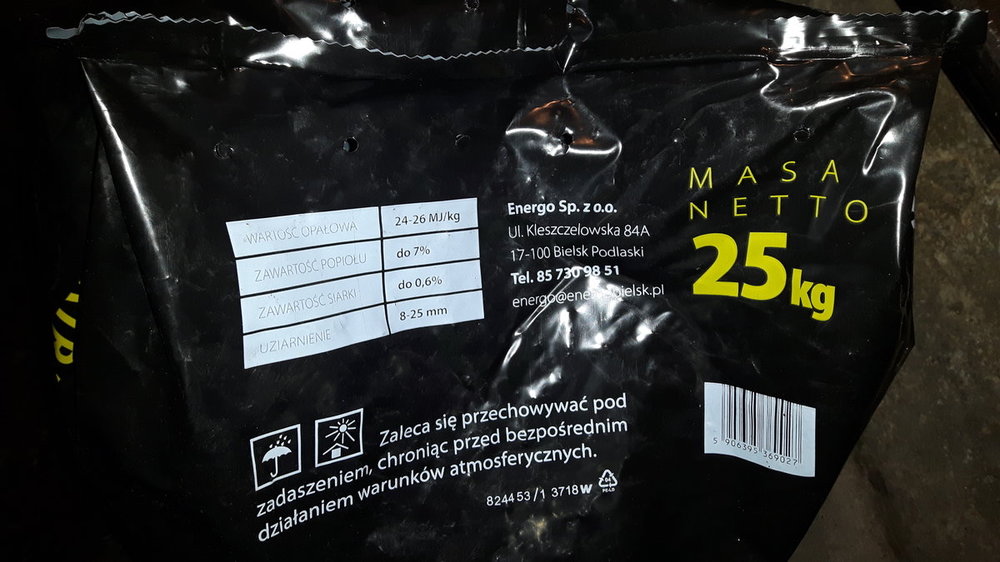 7. Postanowiłem się podpiąć tutaj żeby nie dublować tematów. Jako, że Retopal poszedł w górę i w moim przypadku cena sięgnęła 965 zł za tonę postanowiłem poszukać czegoś tańszego. I tak lokalnie mam w cenie 800 zł brutto ekogroszek Extra od Energo. Na początek zdjęcia frakcji (wizualnie ZDECYDOWANIE ładniejszy wzrokowo niż Retopal), worków [(jakby mnie solidniejsze od tych z PGG i przy załadunku na składzie jeden się rozerwał - może był naderwany, a może szajs, trudno ocenić po jednorazowym epizodzie) (otwory wyłącznie u góry i od spodu, a nie jak w PGG podziurkowany cały worek)], wilgotności (tylko jeden worek z pięciu był wilgotny i brudził dłoń) i dokumentu, który otrzymałem przy zakupie. Waga KAŻDEGO worka to równe 25,3 kg. Ani mniej, ani więcej. Jak Oni to robią? Według sterownika zasyp planuję na pojutrze. Wtedy napiszę jak się pali, ile popiołu, sadzy, itp.