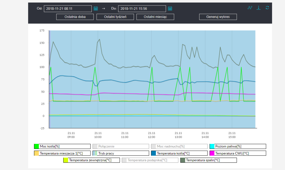 Na powyższych ustawieniach kotłaśrednia temperatura spalin wynosi około 110 stopni C