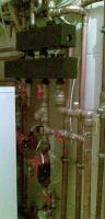 kotłownia na piętrze, za sprzęgłęm zejście rur po ścianie na podłogę, w podłodze ok. 1 m w lewo i później znajduje się trójnik i prawo ok. 1m rura idzie do rozdzielacza na piętrze, ok 0,5 do przodu druga rura idzie i zakręca i schodzi na parter pionem na ścianie, następnie w podłodze ok. 1m do rozdzielacza. Zasilenie i powrót przebiegają obok siebie.