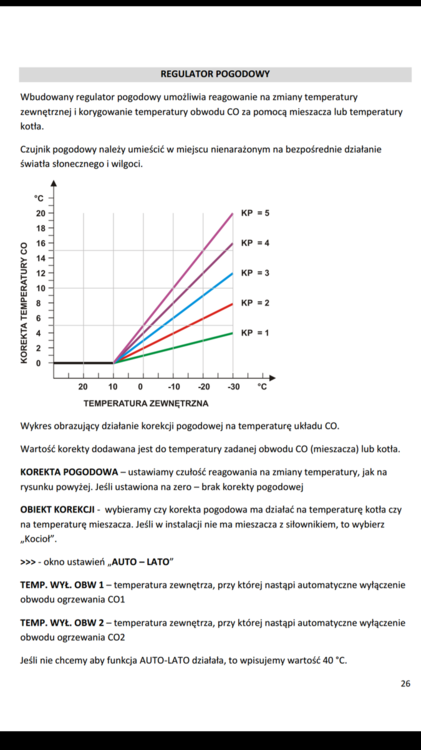 Witam, Przymierzam się do kupna sterownika skzp-02 obecnie testuje działanie aplikacja, zapoznaje się z instrukcją obsługi i przeglądam forum w temacie sterownika. Niestety nie bardzo rozumiem działanie ustawień regulatora pogodowego dla mieszacza. Dla jakiej wartości temperatury zewnętrznej ustawiam temperaturę zadaną dla mieszacza z grafiki w instrukcji obsługi wynika że dla temperatury 10°C ( dobrze to rozumiem???) Jeśli tak jest to dla mojej instalacji wartości zadanej temperatury przy 10°C na zewnątrz wynosi 23°C a w aplikacjach najniższa wartości temperatury zadanej jaką można ustawić to 25°C !???, czy tak samo jest w samym sterowniku?