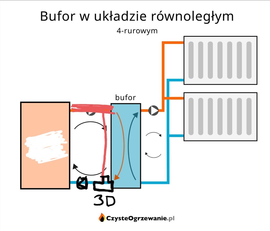 1. Miałoby to wyglądać mniej więcej jak na zdjęciu. Mam tylko obawę że w momencie kiedy piec będzie ochraniał powrót to pompa za buforem będzie mieszać płyn między nagrzewnicami a całym buforem i w rezultacie bufor nie będzie magazynował a nagrzewał się cały równomiernie z płynem w nagrzewnicach.