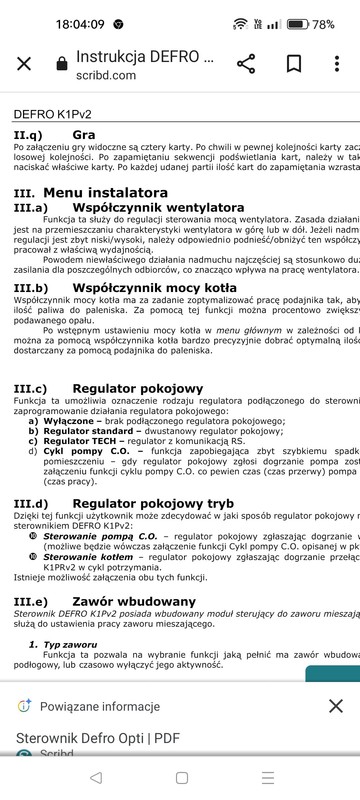 To nie od nadmuchu masz taki materiał w popielniku. Przecież widać że ten węgiel to szajs z kamieniem. No widzę że jest lepiej tylko nie do końca wiem czym steruje ten sterownik pokojowy 1 czy obniża temperaturę na zaworze po dogrzaniu tzw pokojówka. Raczej nie bo nie widzę ikonki ma ekranie. 2 czy wyłącza pompę c.o.,jeżeli tak to dlatego wskazywałem ci opcję cyklu pompy c.o. przeczytaj chociaż i będziesz wiedział na czym to polega. Dobra teraz zmiana w Pid praca ale tylko wentylator roboczy min max. Ustaw na początek 16 -27 i jak wejdzie na obroty sprawdź płomień i oczywiście spaliny. -