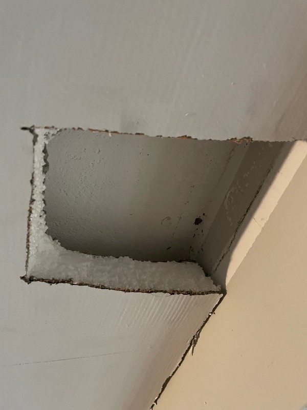 Aktualizacja , nie wiadomo dalej co jest powodem , poprawka ma polegać na zakolkowaniu już istniejącego sufitu … Tak jak widać klej trzyma na suficie stara farba jest na kleju od płyty również , może wina tutaj w gruncie ceresit i on odparzyl ? Ogólnie dlaczego wystąpiło takie wybrzuszenie na jednej stronie to jest dziwne skąd takie naprężenie powstało …