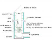 Witam Was. Poniżej zamieściłem schemat paleniska, oczywiście do krytyki, na zrębki. Patrząc od środka. Palenisko o przekroju 20x20cm, wyłożone cegłą szamotową na sztorc gr. 64mm, dalej izolacja 16mm, blacha 3mm i na zewnątrz wełna mineralna. Widać na rysunku dysze powietrza pierwotnego w odległości około 20cm od rusztu - po 2 na każdym boku. Poniżej wlot powietrza wtórnego, które kanałem w cegle szamotowej będzie się ogrzewało i wpadało do palnika otworami 7-8mm. Długość palnika około 190-200mm. Nie wiem jeszcze jaki ma być kształt palnika. Chciałbym go zrobić w kształcie spirali dla lepszego mieszania z powietrzem - mogę go wylać z betonu żaroodpornego. Na początek zrobię z szamotu o przekroju prostokąta - przeskaluje wymiary z kotłów zgazujących. Ponad palnikiem ruszt, który mógłby być montowany na różnej wysokości (może byłaby to regulacja mocy paleniska w zależności od wysokości żaru). Poniżej palnika popielnik i wylot do wymiennika ciepła. Proszę Was o ocenę tego rozwiązania. Heso myślę, że nie zostawisz mnie w potrzebie.