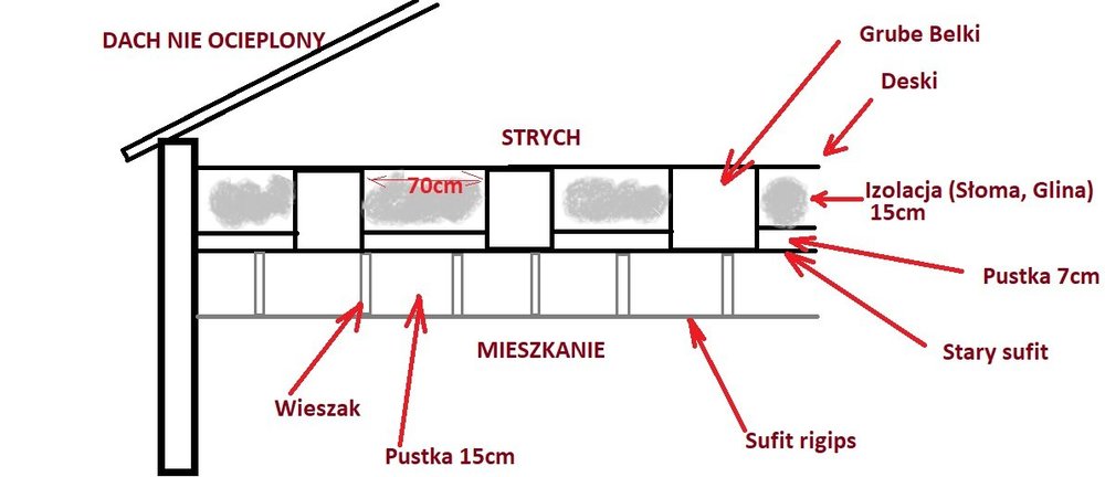 Podepnę się pod temat bo będę zmuszony zrobić ocieplenie - tylko nieco inaczej niż kolega wyżej. Stoję przed wyborem jednej z dwóch opcji: 1) Ocieplić (mieszkanie 75m2) od strony mieszkania - tzn. zerwać obecne rigipsy, dać wełnę 15cm, dać folię paroizolacyjną i na to nowe rigipsy. 2) Ocieplenie od strony strychu - tzn. zdjąć deski, wywalić obecną izolację ~15cm słomy i gliny, wywalić deski poniżej by zwiększyć przegrodę do ~ 22 / 25cm. W to miejsce dać wełnę 2 x 15cm (realnie 2 x 12) I tu pytanie do punktu drugiego, jak dam wełnę między te legary to na to dać folię paroizolacyjną lub paroprzepuszczalną ? Potem na to stare deskowanie. Poniżej rysunek poglądowy.- 87 odpowiedzi