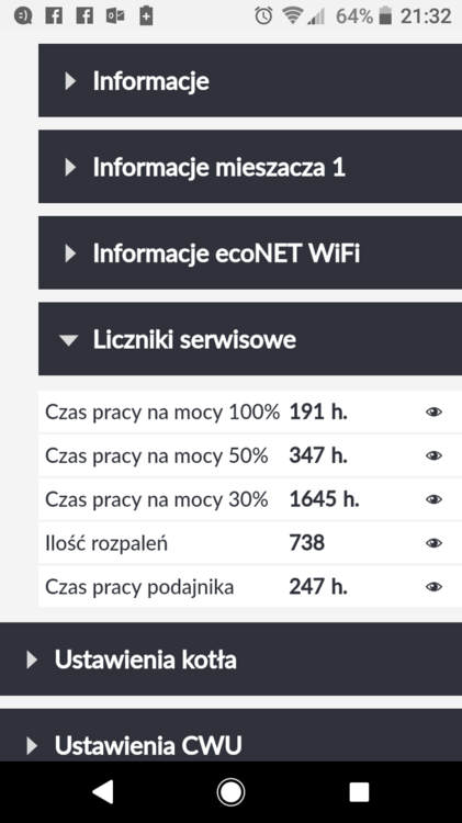 Piwnica-na podłodze styropian, strop nad pietrem-welna 20cm, poddasze nieocieplone, ściany-pustak, styro 8cm,pół pustaka, okna Sokółka 20lat. Ciężko określić ile pracuje na 30 ile na 50. To zależy od dawek. Można tak robić, że w każdych warunkach będzie pracował na 30%, zwłaszcza jak się ma econeta, można siedzieć w fotelu i kombinować z dawkami. Jak napisał kolega @Gunman, tak najlepiej jest ustawić moc 30%, aby nie wchodził w nadzór przy wyższych temp na zewnątrz. Wiąże się to ze zwiększeniem przerwy w podawaniu, ale też jak zrobi się chłodniej, z przechodzeniem częściej na 50% mocy. I tutaj można też na 50% mocy wydłużyć przerwę, tak żeby nie spadał na 100%,a podbijal do mocy 30%. Dlatego nie chce Cie wprowadzać w błąd i podawać statystyki, bo u Ciebie może być całkowicie inaczej i możesz się rozczarować. Myślę, że zrozumiałeś istotę wywodu. Wydaje mi się także, że ta teorię przynajmniej w części potwierdzi kolega @Gunman, po obserwacjach pracy kotla Pana N. Z. Podsyłam Ci liczniki serwisowe, na które nie zwracam uwagi. Nie kasowalem ich od początku. Kocioł uruchomiony 04.07.18r