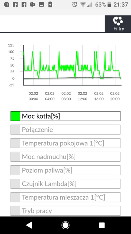 No to dobrze, masz takie ustawienia dawki, przerw. Jak zrobi się cieplej, to będzie podchodził wyżej. Masz szansę, że jak będziesz grzał od termostatu, to nie wejdzie w nadzór przed dogrzaniem pomieszczeń. Histerezy, są to można powiedzieć progi przejść między mocami. Masz h1 na 10st i dlatego pracuje w takim zakresie temp. Obniż h1 na 8, to próg przejścia z 50 na 30 będzie przy 67 i tak będzie się poruszał. Jak chcesz, żeby pracował w zakresie temp np 63, to h1 na 12st. Ale im wyższa temp na instalację, tym wyższa temp na kotle, czyli h1 niżza, żeby woda chłodniejsza z instalacji mogła się mieszać z cieplejszą i nie wychładzać tak kotła.