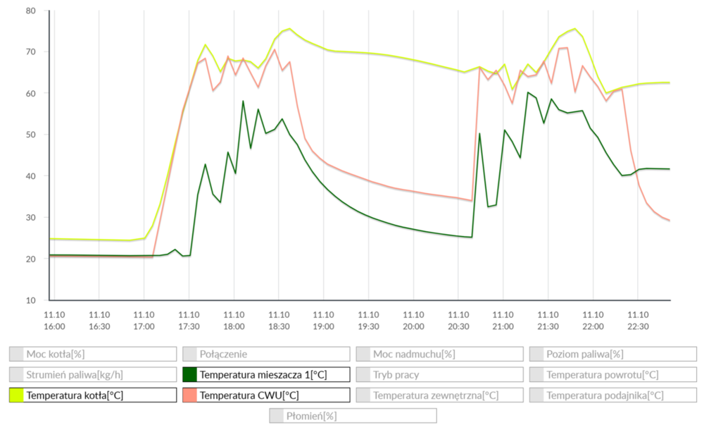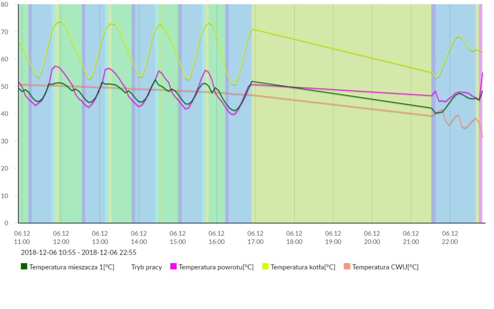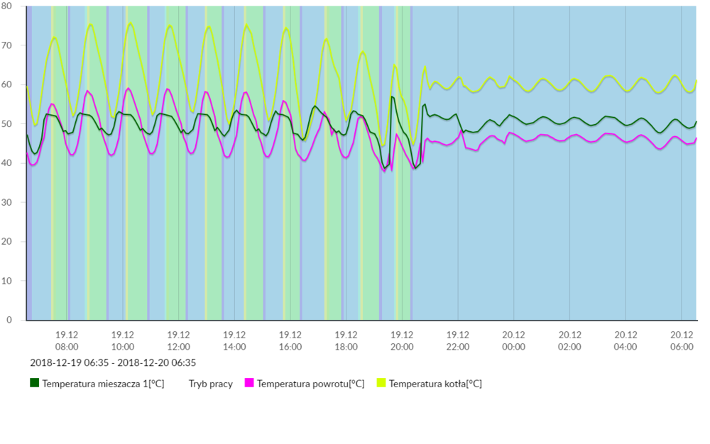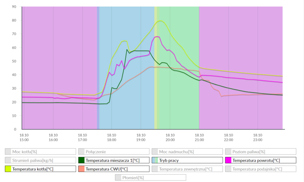 Po wczorajszym dniu zabaw z temp kotła + histereza, wyszło mi coś takiego jak na wykresie. Niestety od godziny 19-20 zaczęło mocno wiać i mimo RCK wydaje mi się , że to też wpłynęło na wynik. Czekam na czujnik spalin by sprawdzić co w komin ucieka. -