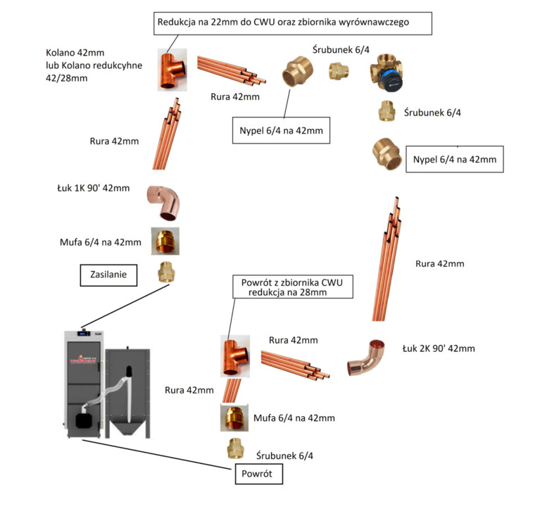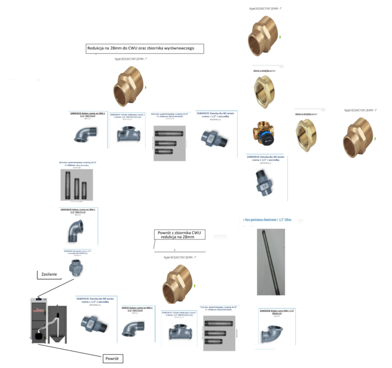 Witam. Prosiłbym o doradzenie przy doborze elementów do wykonania obiegu kotłowego. Ponieważ wyjście z kotła i zawór 4D mam 6/4 więc muszę stosować rury i kształtki 42 mm co wiąże się ze sporymi cenami, w związku z czym wolałbym uniknąć niepotrzebnych elementów i błędów. Opisując układ to za śrubunkiem od strony zasilania daje mufę+kolanko i idę w stronę czopucha pieca (niestety zasilanie i czopuch są w jednej osi) następnie za pomocą trójnika rozdzielam układ tak by na prawo iść do zaworu 4D a do tyłu iść w stronę zbiornika wyrównawczego i układu CWU, przy okazji redukując na 28mm. Powrót z zaworu 4D próbuje zrobić najprostszą drogą do powrotu kotła. Czy w jakiś sposób mógłbym jakoś uprościć układ ? Jakieś wskazówki ? Zmiana fragmentu na czarną stal? Widoczne błędy. Proszę o wyrozumiałość, dotychczas moje walki z zaworami/śrubunkami/kolanami itp, tyczyły się jedynie dołożenia nowych grzejników, a pierwszy raz przyłączam kocioł,a poprzedni miał kwadratowe flansze...